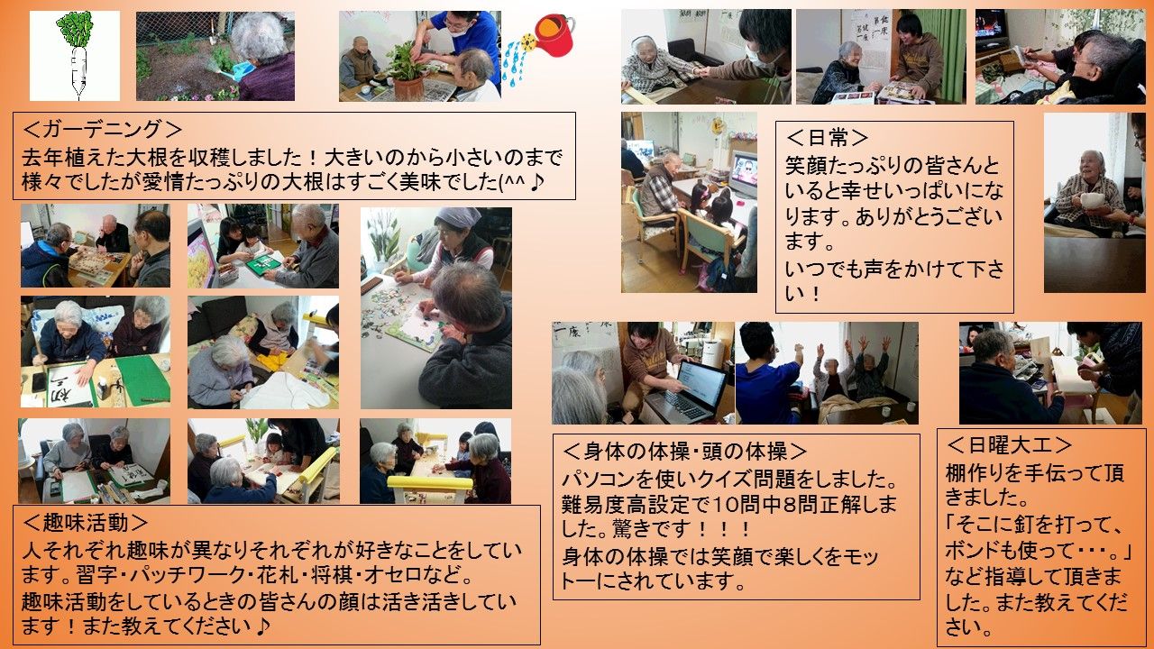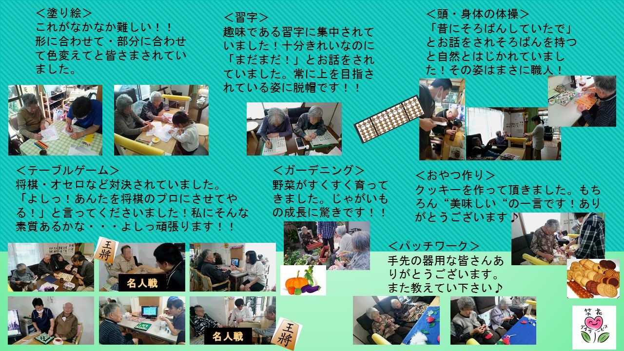 10月号 思い出日記 10月に入り一段と冷え込むようになってきましたね~(*_*) しかし笑花デイサービスの利用者さんは元気いっぱいです♬ その元気でスタッフのみんなも元気いっぱいです(^^♪ さっ!この調子で冬に立ち向かっていきましょう!!